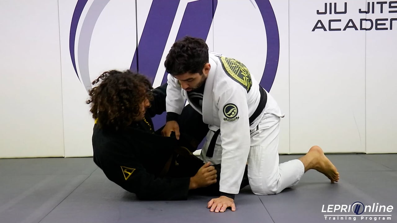 Professor Lucas Lepri teaches how to escape from the opponent’s half guard. Lucas starts in the opponent’s half guard. He immediately under hooks the opponent’s far side arm before they are able to also under hook. Lucas now controls the head with his other arm and applies pressure to keep the opponent flat on the mat. He now takes the opponent’s lapel out and feeds it to the hand behind the head. Lucas uses his shoulder to apply pressure on the opponent. The outside hand is now used to push the opponent’s leg down, so Lucas can slide his knee out. From here, he under hooks once again and cuts his knee to the side to pass.