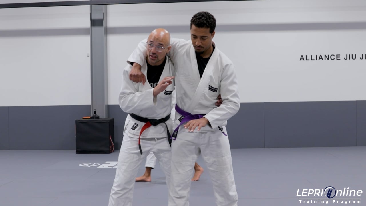 Professor Edson Oliveira shows how to get out of a headlock when an opponent tries to hit. She shows a variation when the opponent also connects their hands. Instead of pulling away, Edsongrabs the arm and holds it tight against the body. He steps the leg inside theirs and pushes the hips forward so they can't pull down. He then steps back and slides the head out, keeping it very close to the shoulder so they can't hit. From Edson, can trip the leg or move to the back.
