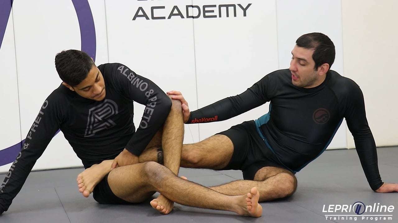 Professor Lucas Lepri teaches how to escape from a heel hook attempt, when the opponent tries to pass and locks Lucas’ leg in a figure four. The opponent is trying to pass and then leg drags Lucas’ leg. He sits back and locks the legs in a figure four in an attempt to get the heel hook submission. Lucas immediately turns his heel back and turns to the side. He uses one hand to push the knee away as he posts on the mat with his other hand. Lucas then brings his other foot in to help him push the leg away. He now pushes away and rolls to the other side to escape.