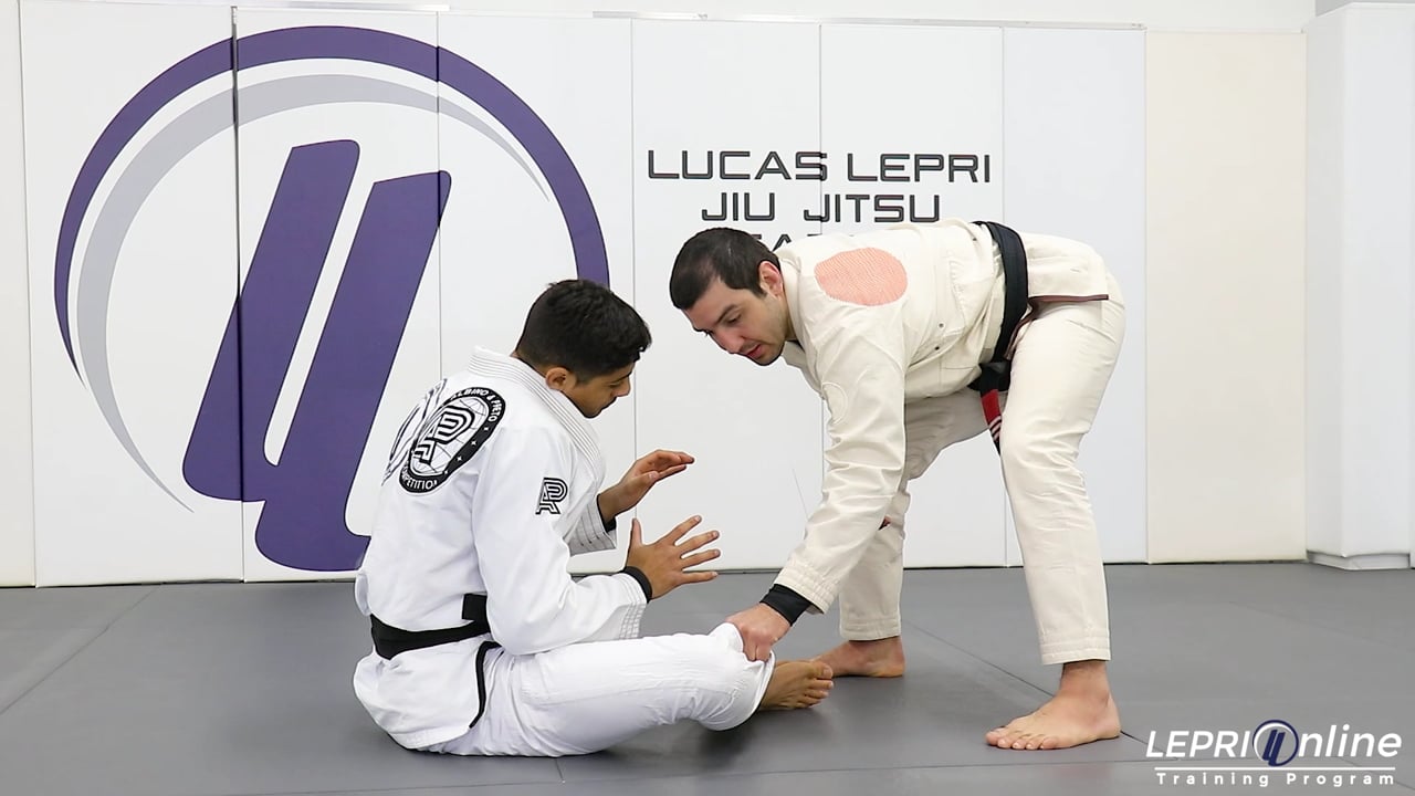 Professor Lucas Lepri shows how to do a jump pass drill. Lucas is standing and the opponent starts to sit up from laying on his back. As soon as the opponent sits up, Lucas comes in and grips the near side leg. He now uses his other hand to grip the middle of the back as he jumps to the side. From here, Lucas can go to the knee on belly or the side control. The drill is then repeated side to side and alternating the grip on the pants.