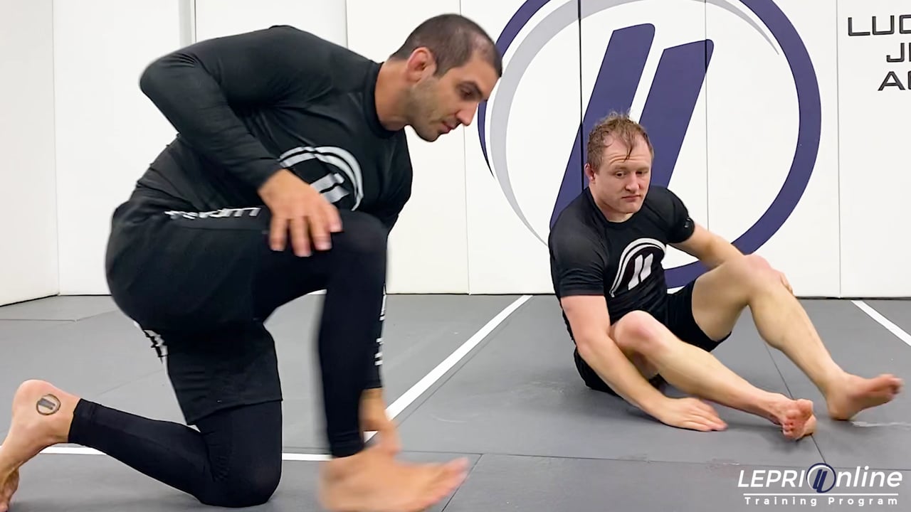 Professor Lucas Lepri teaches how to get an arm triangle after attempting the knee cut pass and the opponent defends by under hooking. Lucas starts by gripping the ankles and pulls them up to make the opponent place their back on the mat. He then goes for the knee cut pass but the opponent defends by under hooking. Lucas immediately locks his hands together, one over the head and the other under the arm. He now rolls forward over his shoulder. Lucas now keeps his elbows locked and curls in to finish the arm triangle.