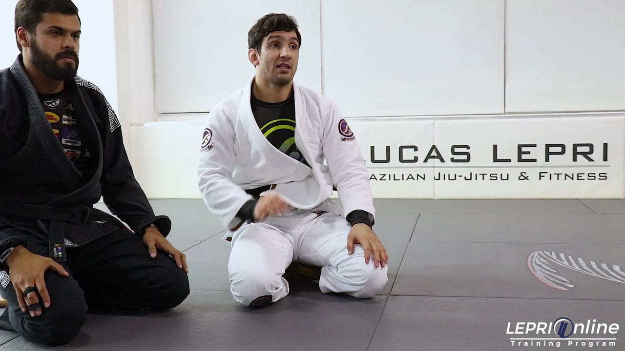 Professor Lucas Lepri demonstrates an efficient way to recompose the guard and sweep an opponent who is attempting a knee cut pass. When the opponent starts to apply the knee cut pass Lucas pushes the opponent away with his arms to insert the half lasso and grip the sleeve. He grips his other sleeve and pushes the opponent away with the lasso in order to use his other leg and establish the half lasso and spider guard. Lucas then removes the lasso to apply the De La Riva and drops his other foot to the ground to sweep the opponent to the side.