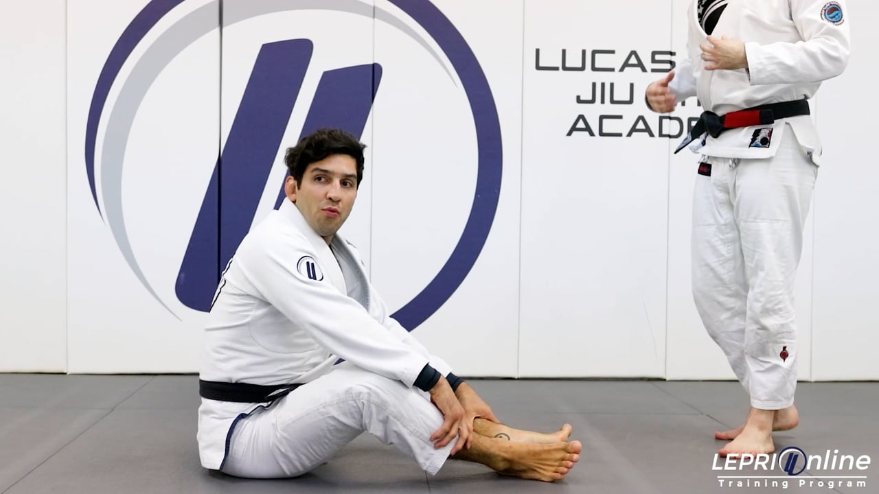 Professor Lucas Lepri teaches how to defend from a knee cut pass and sweep the opponent using the tornado sweep. The opponent goes for a knee cut pass and Lucas starts to defend using the knee shield. He then reaches underneath his own leg to grip the opponent’s pants near the foot. Lucas releases the grip on the collar and uses that hand to also grip the other leg. He gets inverted and spins underneath the opponent to sweep. The opponent defends by locking his legs over Lucas’ after the sweep. Lucas sits on the opponent, under hooks and turns to the other side applying pressure. From here, Lucas passes to the side control.