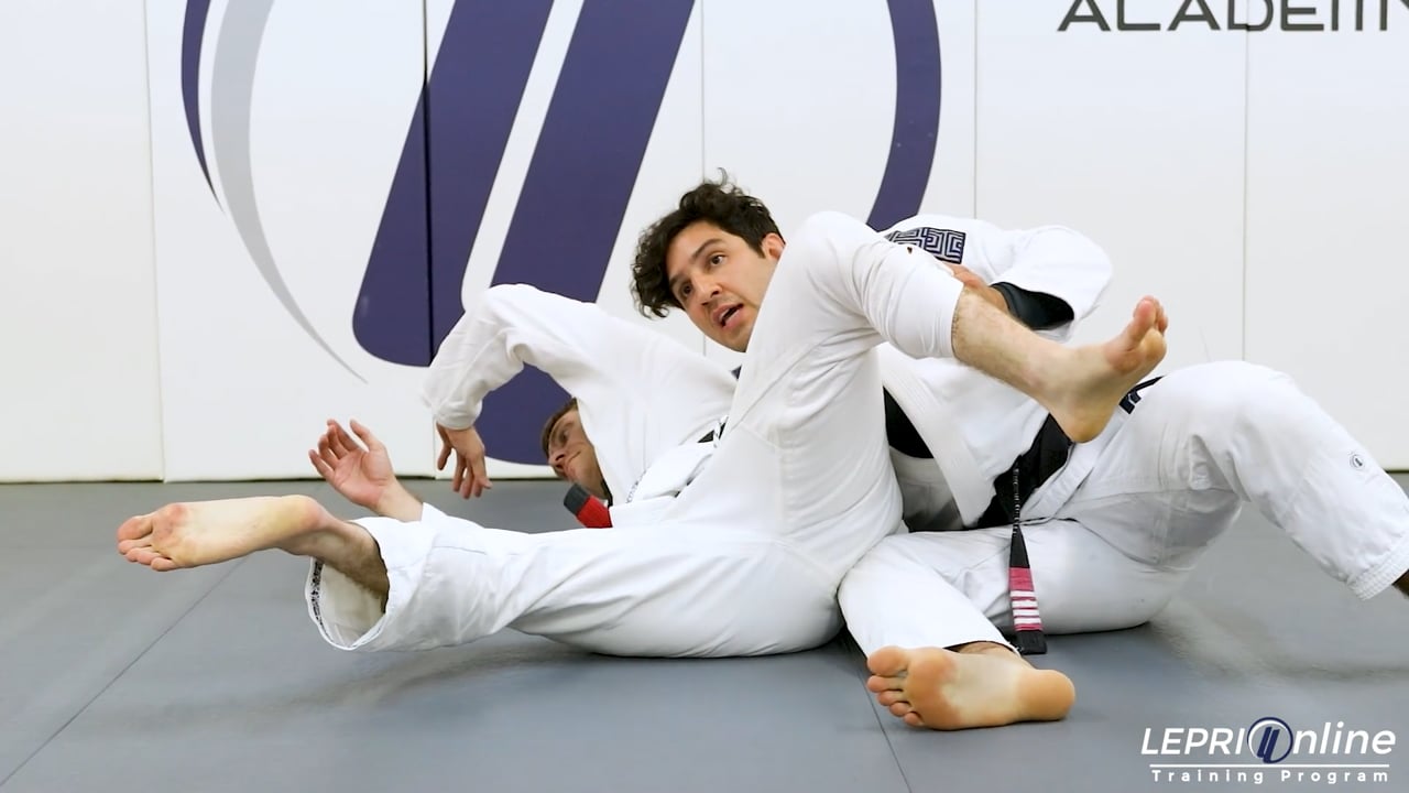 Professor Lucas Lepri teaches how to defend from a knee cut pass and take the back or takedown, after attempting a tornado sweep. The opponent goes for a knee cut pass and Lucas starts to defend using the knee shield. He then reaches underneath his own leg to grip the opponent’s pants near the foot. Lucas releases the grip on the collar and uses that hand to also grip the other leg. He gets inverted and spins underneath the opponent in an attempt to sweep. In this scenario, the opponent prevents the sweep by posting forward with both hands. Lucas pushes the opponent forward by placing his foot on the waist and kicks forward. This allows Lucas to stand up while still controlling the pants. From here, Lucas can jump to the back take or he can step to the side and extends one leg to take the opponent down by making them trip over the leg.