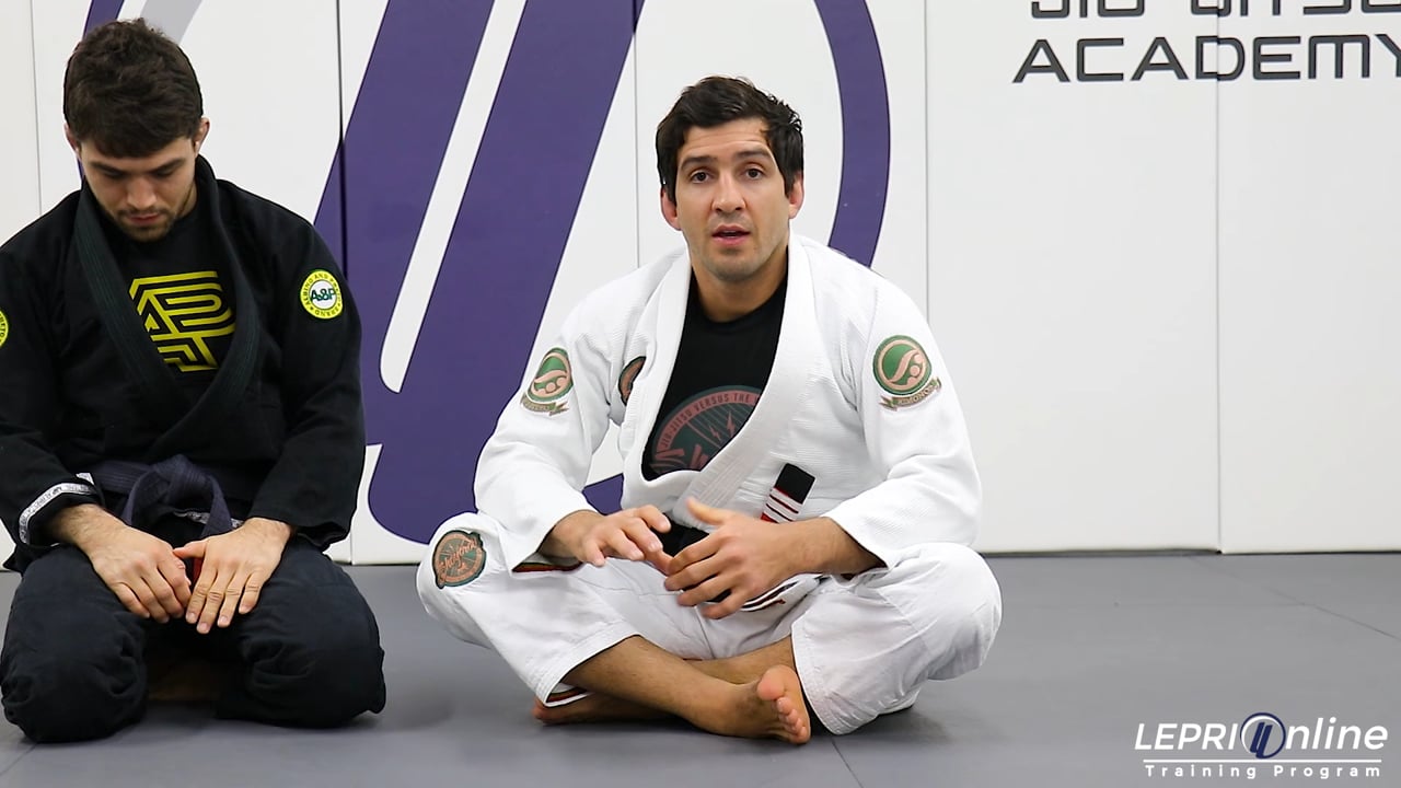 Professor Lucas Lepri teaches how to take the back, after attempting a sweep from the deep half guard. Lucas starts with the opponent trying to pass and uses the knee shield to block the opponent. He controls the sleeve and cross grips the same side collar. Lucas sits up and drops his knee so he can under hook that same side and grips the back of the pants. The hook on the opponent’s leg is now switched so Lucas can trap the opponent. Lucas now under hooks the other leg and bridges up to make the opponent release the collar grip and post on the mat. The arm that was under hooking the leg is now taken out and Lucas slides his head out to the side. He reaches for the collar grip and then hip escapes to the side so he can take the back from there.