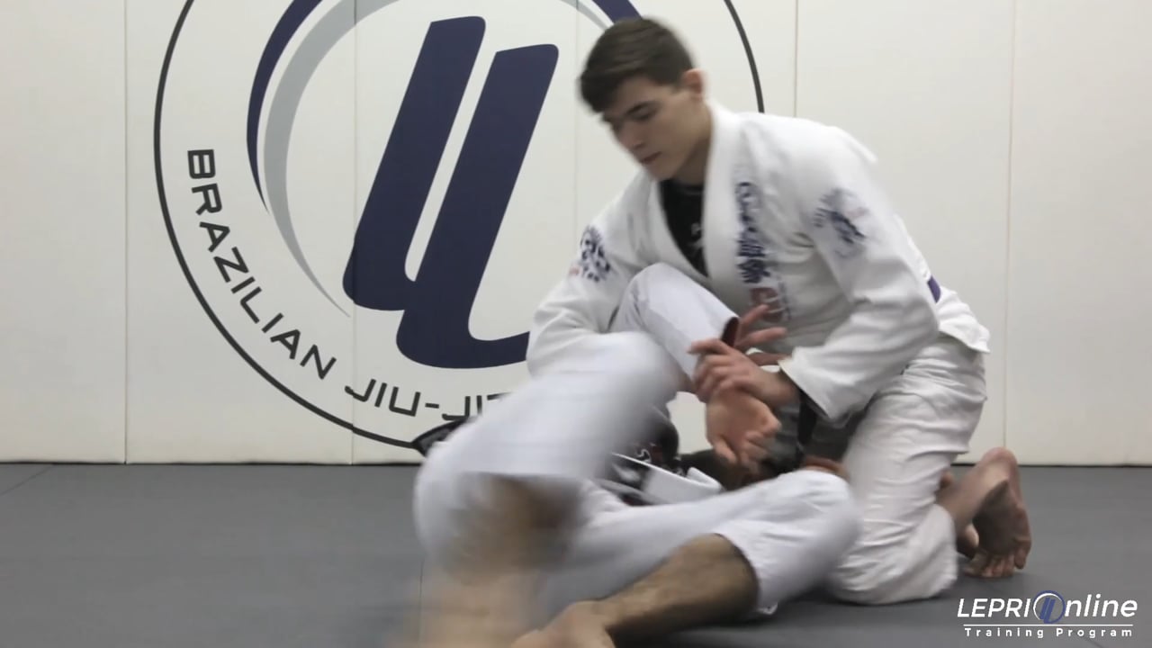 Professor Lucas Lepri teaches how to escape from the Kimura trap when the opponent is kneeling over his other arm. Lucas first grabs his own lapel to delay the attack. He then turns and puts his knee behind the opponent's elbow when the opponent tries to break Lucas' lapel grip. Lucas pushes the elbow with his knee, pulls his arm out of the lock, and pushes finally pushes the opponent with his hands and feet to spin and recompose open guard.