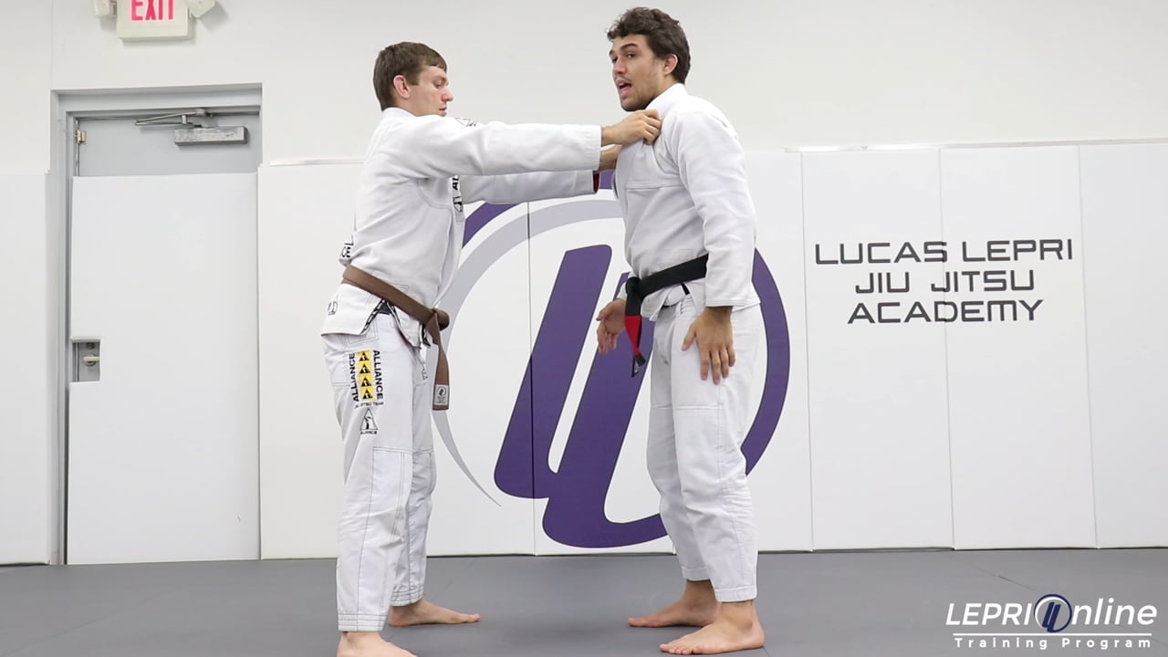 Professor Frederico Silva teaches how to throw an opponent with the Koshi Guruma hip throw when the opponent grabs him by the front. The opponent grips both of Frederico’s collars. Frederico slides both hands in between the opponent’s arms and places one hand on the elbow and the other over the opponent’s shoulder. He moves in placing his hips in front of the opponent and then throws the opponent. Once on the mat, Frederico control the side control position.