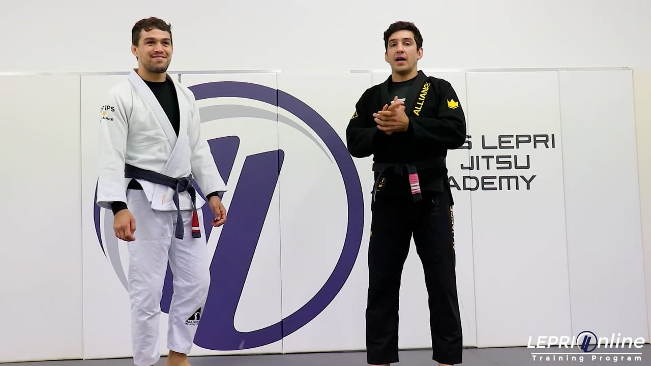 Professor Lucas Lepri shows how to do the koshi guruma throw and then gets to the mount position. Lucas controls the sleeve with one hand and the collar with the other. He releases the grip on the collar and reaches over the shoulder to grip the back as he steps in. Lucas places his hips in front of the opponent and pulls him over the hips to throw him. Once on the mat, Lucas immediately goes for the knee on belly position. From the knee on belly position, he then transitions to the mount position.