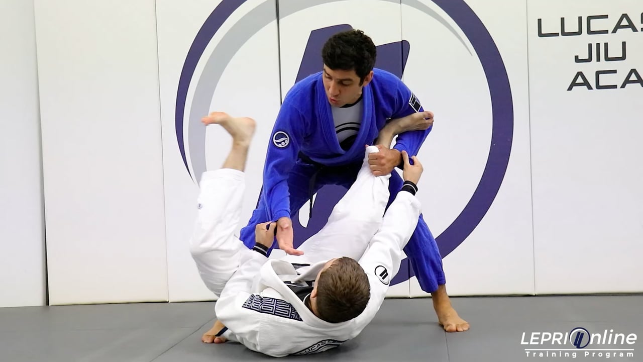 Professor Lucas Lepri shows a drill on how to pass the guard when the opponent goes for the lasso. The opponent starts with spider guard and goes for the lasso. As soon as the opponent goes for the lasso, Lucas circles his arm out and places that hand on the thigh. The other hand is circled in and to grip the inside of the pants. Lucas now pushes the leg down, steps back and moves into the side control position.