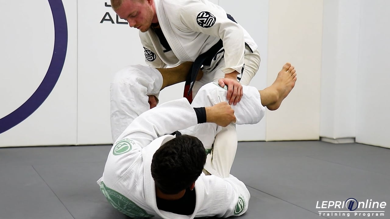 Professor Lucas Lepri shows how to get the straight ankle lock while the opponent is still standing. Lucas starts with the lasso and de la riva. He pulls the opponent in so he can grip the ankle of the de la riva side. The opponent now pushes the de la riva leg down and Lucas slightly turns his hips so he can slide his elbow behind the ankle. Lucas now slides his arm through, in between the ankle and his own thigh to be in the straight ankle lock position. He now presses his knee down over the opponent’s leg to get the straight ankle lock submission.