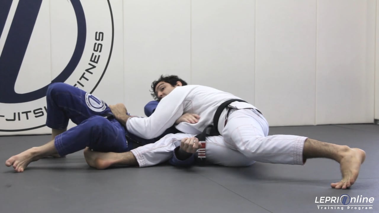 Professor Lucas Lepri teaches how to pass an opponent's sit-up guard and establish the side control position. The opponent begins in De La Riva guard holding Lucas' ankle and sleeve. As the opponent establishes the sit-up guard position, Lucas grips the upper back and outside of the knee and then pushes the opponent's foot to the mat. He then steps to the outside while dropping his head below the opponent's chin to pass the guard, switching his grip from the knee to the hip at the end of the sequence to establish the side control position.
