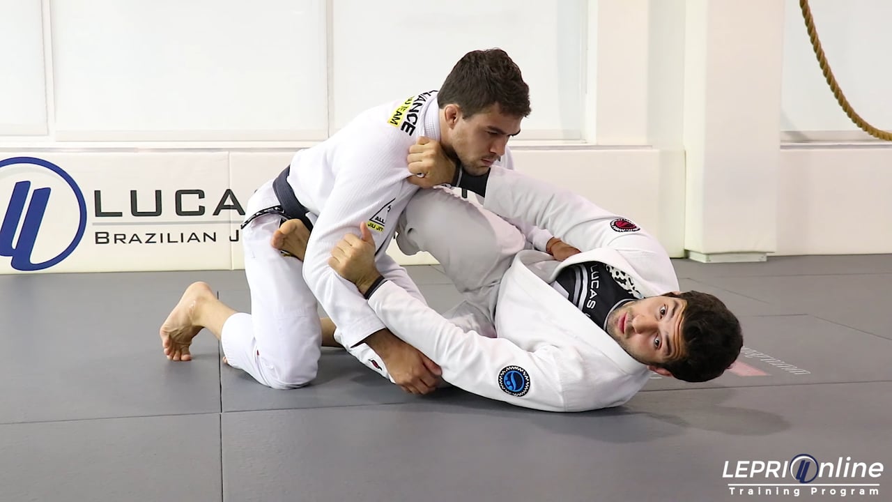 Professor Lucas Lepri shows how to escape from the mount position by trapping the opponent's arm and leg, but in this scenario the opponent posts his leg out. Lucas grips the opponent's sleeve with his opposite hand and the shoulder with his same side hand. He uses his foot to trap the opponent's ankle of the same side he is gripping the arm. Lucas then bridges in a diagonal direction over his own shoulder but the opponent is able to post out. Lucas immediately puts his elbow and knee under the opponent’s leg. He brings the leg to the other side while switching his hands to block the opposite shoulder. Lucas then shrimps out and gets the opponent in his closed guard.