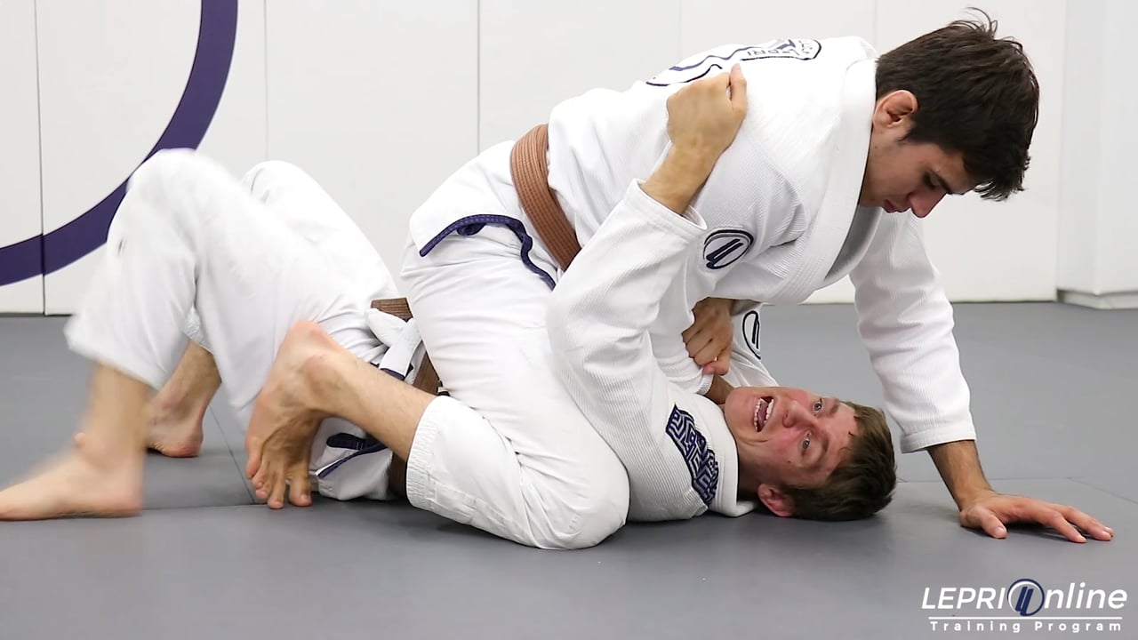 Professor Donovan Espinosa teaches how to escape from the mount position when the opponent has a cross collar grip. Donovan immediately control the grip on the collar by gripping the wrist. He uses his other hand to grip the opponent’s same side shoulder and pulls the opponent in. He then traps the foot on the same side as the shoulder grip and bridges to that side. Donovan then ends up in the opponent's closed guard.