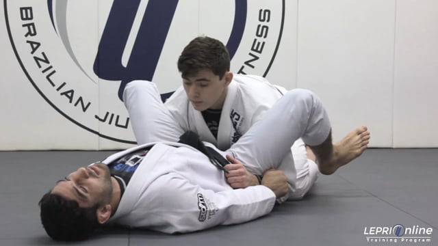 Professor Lucas Lepri shows how to apply the no-arm triangle choke when an opponent attempts a double under pass. When the opponent pulls Lucas toward him to start applying the double under pass, Lucas picks a side and establishes a deep cross-collar grip with his forearm under the opponent's jaw line. He then wraps his leg behind the opponent's neck and holds his own shin before locking the no-arm triangle and squeezing for the submission.