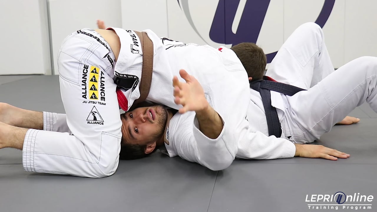 Professor Frederico Silva shows how to escape from the north south position and get to the closed guard. The opponent transitions from the side control to the north south position. Frederico grips the belt with both hands and extends his arms to keep the opponent away. When the opponent applies pressure, Frederico pendulums his legs so he can turn and comes up on his elbow. He then slides his foot in and transitions to the closed guard.