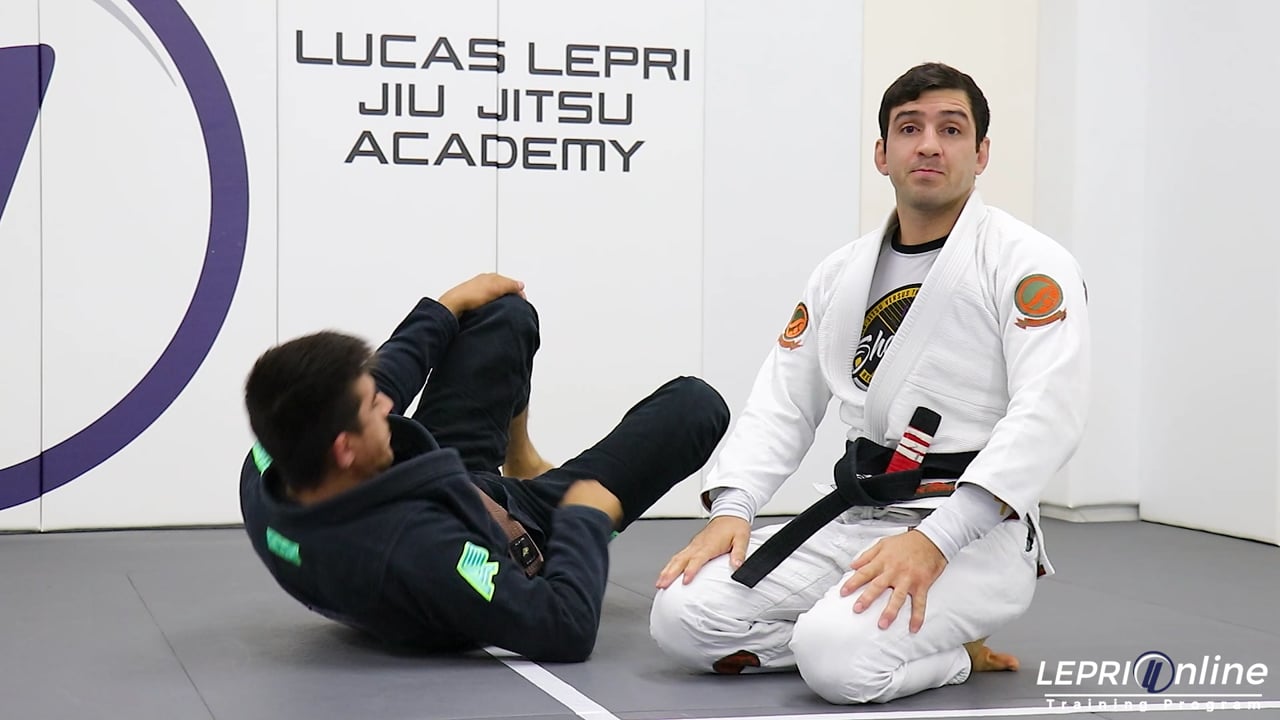 Professor Lucas Lepri teaches a variation on how to escape from the omoplata when the opponent locks their feet together. The opponent is playing guard and is able to pull Lucas‘s arm in and locks his feet together to go to the omoplata. Lucas immediately defends by gripping the back of the opponents pants. He pulls the opponents hips off the ground and places his knee behind the back. He now turns his elbow in so he can escape the arm out. This allows Lucas to escape from the omoplata attempt.
