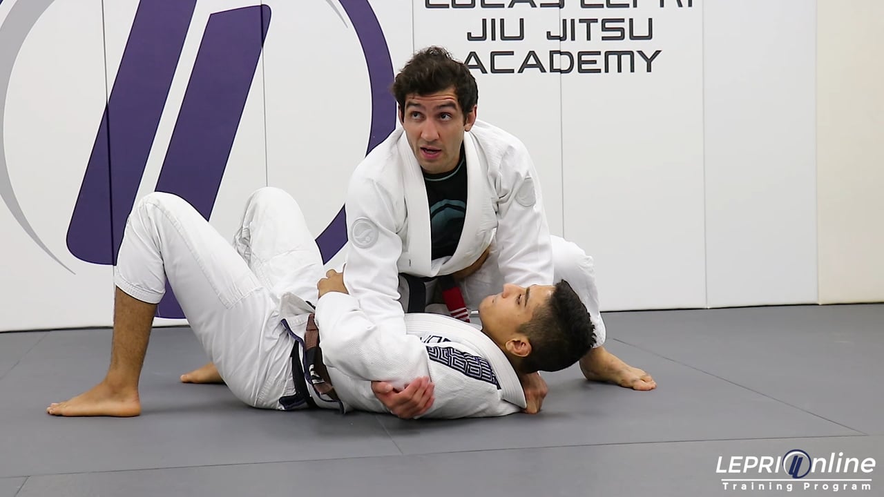 Professor Lucas Lepri shows how to get to the knee on belly and how to get the triangle choke after the opponent escapes an armbar attempt. Lucas passes the opponent’s open guard and places his knee on the belly. The opponent tries to shrimp out to escape but Lucas maintains the position. When the opponent pushes on the knee, Lucas under hooks the arm and cups the elbow. He pulls the opponent towards him and then spins around to get the armbar. If the opponent is able to escape by spinning around, then Lucas goes for the triangle choke instead.