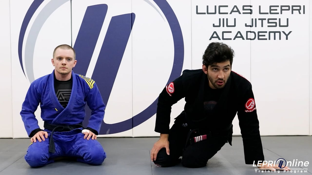 Professor Lucas Lepri teaches how to get an armbar or triangle from a half lasso position. Lucas starts with the open guard and reaches for both of the opponent’s sleeves. He pulls guard and goes for the half lasso on one side and the spider on the other side. The opponent tries to defend by placing the knee on the back of Lucas’ leg. Lucas removes the opponent's knee by releasing the half lasso and uses that leg to push the knee off as he pulls the same side sleeve in. Lucas now immediately raises his hips and locks his legs over the opponent’s shoulder making sure he points his knee in towards the head. From this position, Lucas can go for the armbar. If the opponent attempts to defend by opening the arm, then Lucas just goes for the regular triangle.