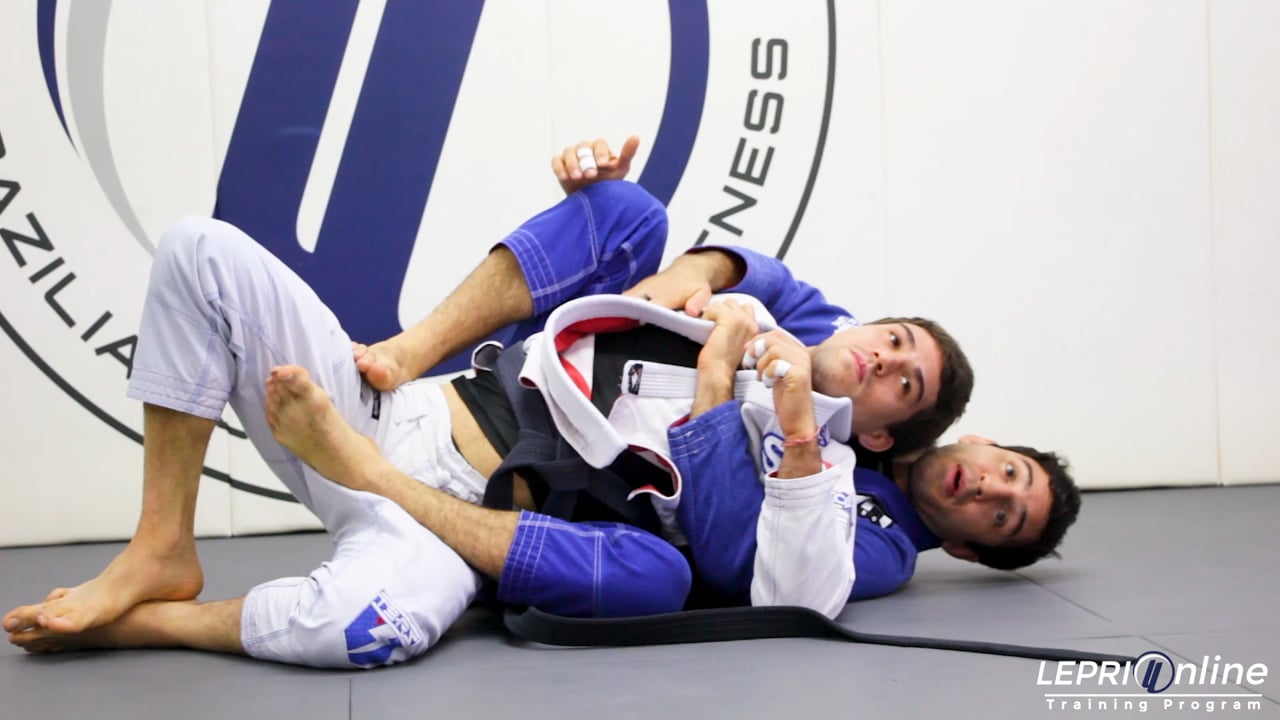 Professor Lucas Lepri shows a variation of an Omoplata attempt to the back take. Lucas starts by playing the open guard and grips the opponent’s cross sleeve and under hooks the near side leg with his other arm. Lucas then raises his hips and tries to go for the Omoplata submission, but the opponent blocks him with his elbow. Lucas abandons the Omoplata attempt and immediately slides his knee into the near side opponent’s leg. He then brings his other leg around and over the opponent’s same leg and places his calf on the back of the opponent’s knee, making him bend his leg. He scissors his legs and makes the opponent turn. Lucas then reaches for the pants and cups the opponent’s hips. He comes up and seat belt grips the opponent's hips. The opponent then tries to defend by rolling forward and Lucas rolls with him trapping the opponent’s legs with his own. Lucas then has to bring the opponent up by gripping the cross collar from behind and also the collar behind the opponent’s head with his other hand. One he brings him up, Lucas establishes the back take.