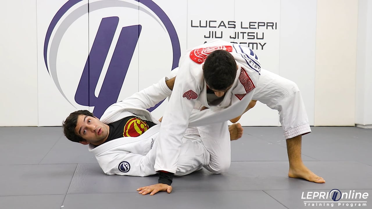 Professor Lucas Lepri shows how to take the back or the mount position after attempting to sweep the opponent from the one leg x. Lucas has the open guard and places his foot on the mat and pushes the opponent's arm away so he can transition to the one leg x. Lucas removes the foot from the bicep and places it behind the opponent's knee. Lucas now reaches for the pants and moves his hips back so he can then pull the opponent towards him. He places one hook in, but the opponent tries to defend by rolling. Lucas follows the roll and finishes taking the back. If the opponent turns, then Lucas can also transition to the mount position.