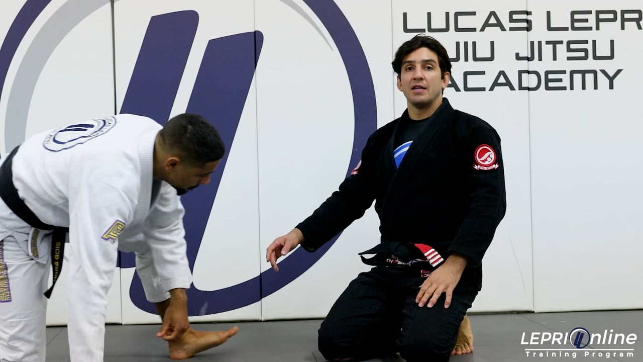 Professor Lucas Lepri teaches how to pass when the opponent has the open guard with lapel and collar control. This defense can be used when the opponent is in the close guard or open guard. Lucas starts defending by maintaining the grip on the collar and maintains his weight on the chest. The other hand is used to grip the far side leg near the knee. He starts to walk the side so he can bend his knee and slide the foot out. He then starts to walk all the way around to the other side, pushing the leg down and going for the knee cut to pass.
