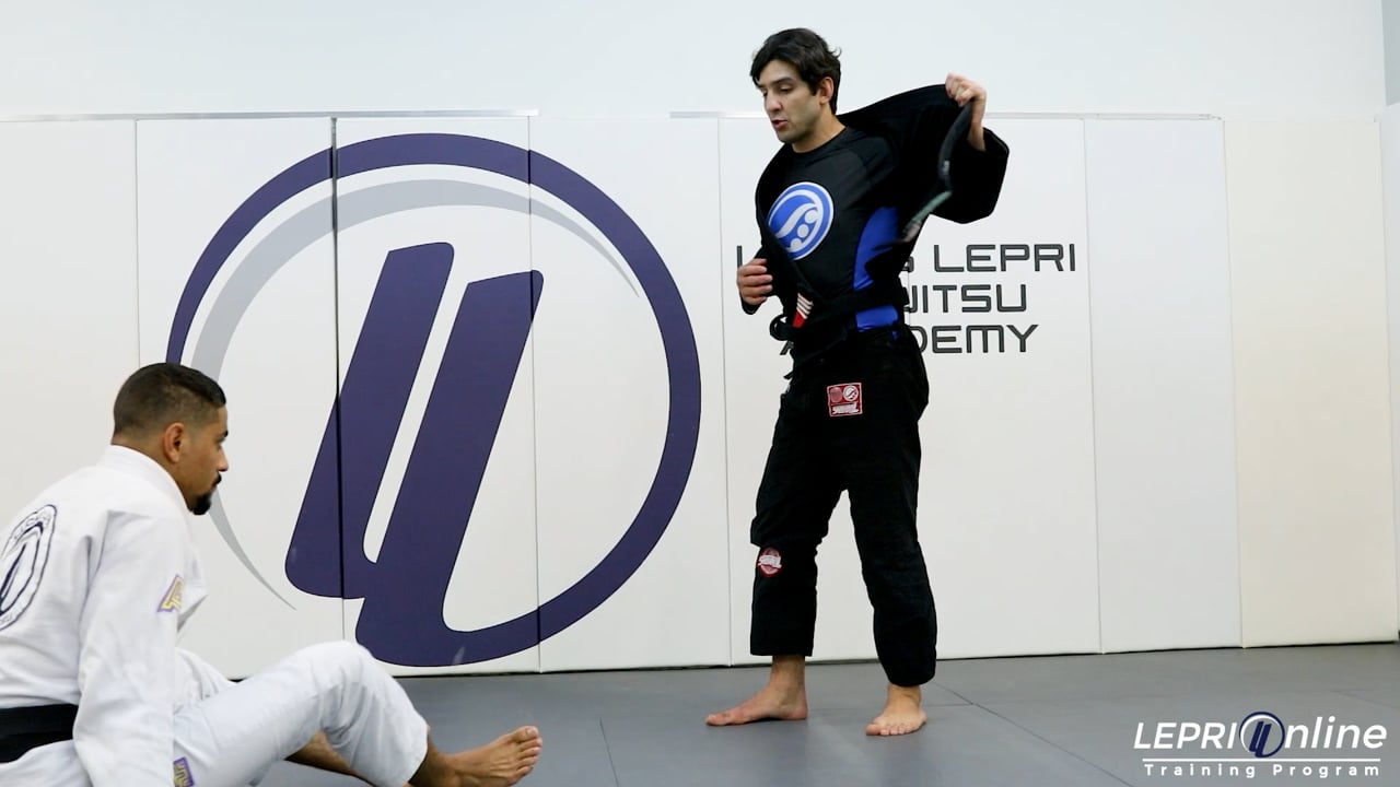 Professor Lucas Lepri teaches how to pass when the opponent has the open guard with lapel and collar control. This defense can be used when the opponent is in the close guard or open guard. Lucas starts defending by maintaining the grip on the collar and maintains his weight on the chest. The other hand is used to grip the far side leg near the knee. In this variation, the opponent slides his knee in, preventing Lucas from moving to the side. Lucas now switches the grip to the other leg and the grip on the collar is moved to the near side leg. Lucas pushes both legs down and starts walking back to the north south position. From here, Lucas maintains the north south position.