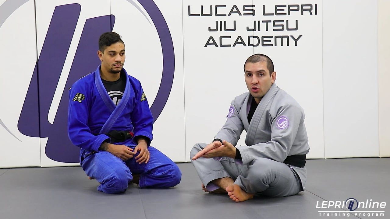 Professor Lucas Lepri teaches how to get the triangle submission when he sweeps the opponent with a scissor sweep and they come back up. Lucas is in the open guard with his feet on the waist and controlling the sleeves with his hands. The opponent raises his knee and Lucas places one foot on the bicep and the other on the mat. He scissors his legs to sweep the opponent. The opponent tries to come back up and Lucas immediately slides his leg over the shoulder to go for the triangle. Lucas now locks his legs together and finishes the triangle submission.
