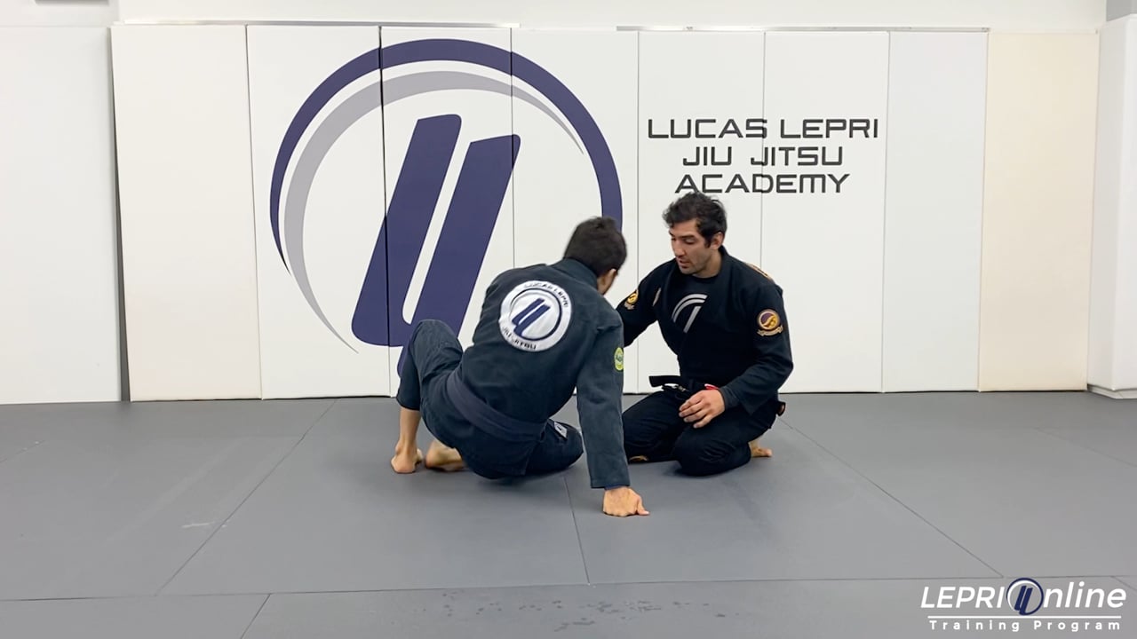 Professor Lucas Lepri teaches how to open the closed guard by making the opponent readjust. The opponent has Lucas in the closed guard and Lucas reaches for the belt with both hands. As he pushes on the belt, he moves himself away making the opponent readjust their guard. Lucas locks his elbows over the legs to prevent the opponent from attacking them. He stands up and steps in so he can place his knee in between the opponents. He now comes back down and uses the knee to open the opponent’s guard. From here Lucas, can now pass.