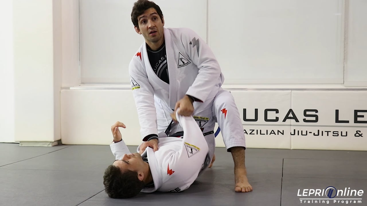 Professor Lucas Lepri demonstrates how to open the closed guard and how to pass the open guard. The situation starts with Lucas in the opponent's closed guard. Lucas grips both of the opponent’s lapels with one hand. He uses the other hand to grab the opposite sleeve. The same side he’s holding the sleeve, he lifts his leg and places it on the mat. Lucas transfers his weight to the leg he posted so he can then bring his other leg up. He is now standing up while the opponent still has their closed guard. Lucas still controls the sleeve and uses his free hand to grip and push on the opponent’s same side knee. Lucas back steps as he pushes the knee down and opens the opponent’s guard. The grip that was on the sleeve is now transferred to the same side knee. With both knees gripped, Lucas steps both feet back. Lucas picks one side and starts moving towards it. The knee of the side he picks is pushed down and away. Lucas comes to the side and places his shoulder on the chest. He then releases the grips and goes to the side control position.