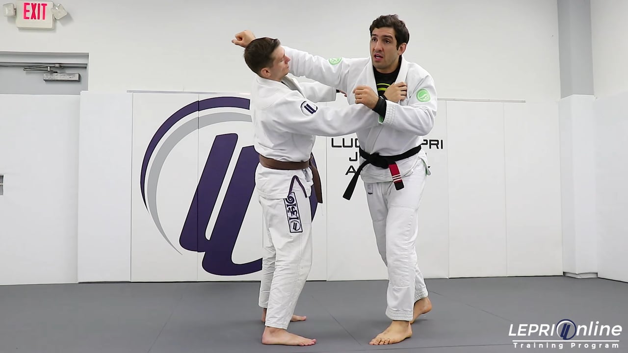 Professor Lucas Lepri shows the Osoto Gari entry drill. Lucas starts with the same side collar grip and same side arm grip. He takes a step in the direction of the arm grip. As he moves to the side, he pushes and pulls on the grips as he places his other leg behind the opponent’s leg. Lucas then resets and repeats the entry over and over.