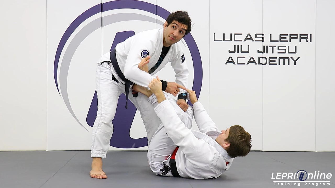 Professor Lucas Lepri shows how to take the opponent down using the Osoto Gari throw. Lucas controls the collar and arm. He pulls on the opponent to make him step forward. As the opponent steps forward, Lucas now steps to the same side and brings his opposite leg behind the opponent's. He uses the collar grip to push the opponent back as he trips with the leg. Lucas takes the opponent down and immediately goes to the knee on belly.