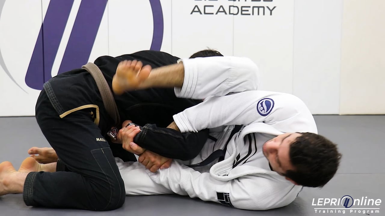 Professor Lucas Lepri teaches how to get the armbar submission after attempting a kimura, when he sees that the opponent is going for the over under pass. Lucas is playing guard and the opponent grips Lucas’ leg so he can go under the other leg for the over under pass. Before the opponent is able to go for the pass, Lucas immediately goes for the kimura grip on the arm that was placed on his leg. In this scenario, Lucas tries to finish the kimura but the opponent defends by gripping his own belt. Lucas brings his outside leg over so he can push on the hip. By pushing on the hip and pulling the arm, he is able to break the grip and finish extending the arm for the armbar submission.