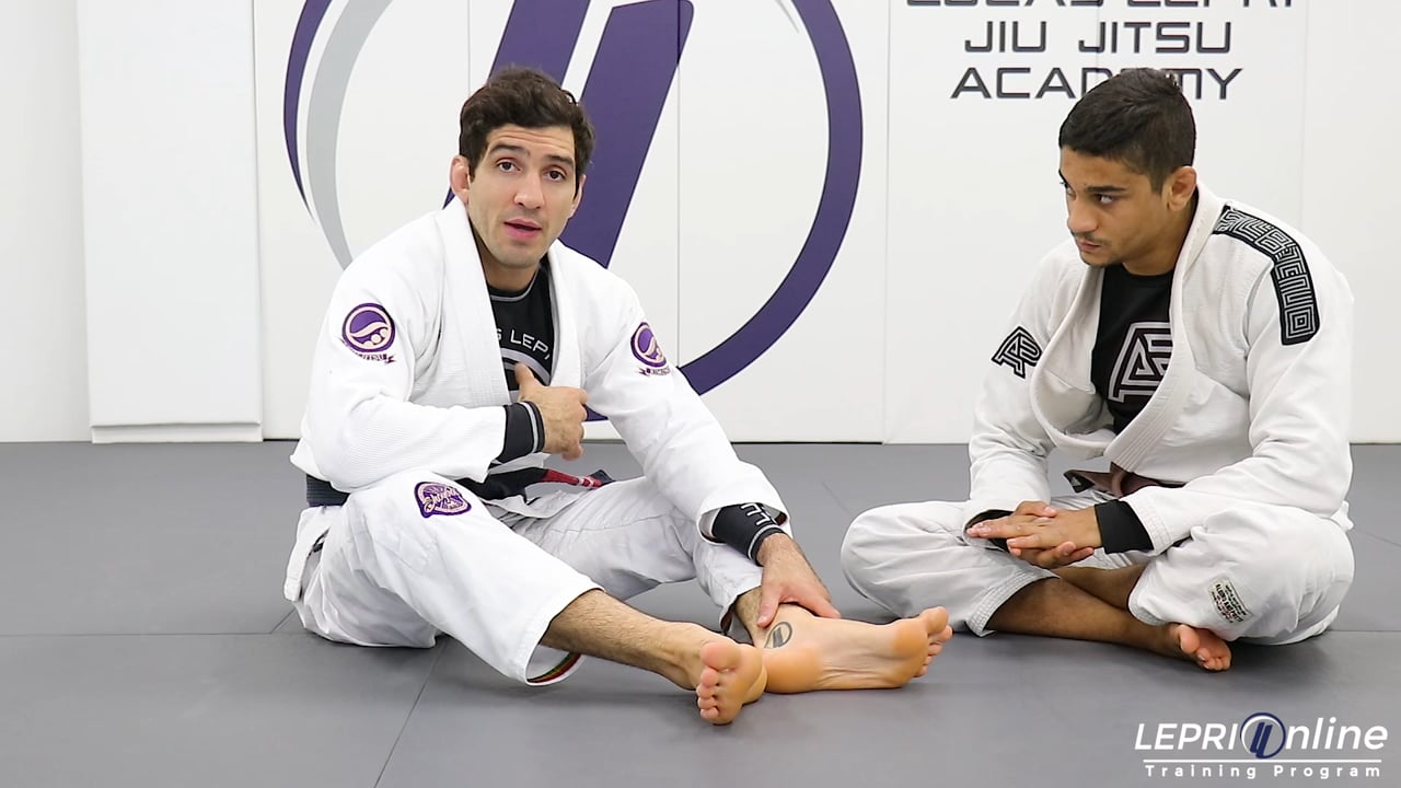 Professor Lucas Lepri shows another defense to an over under pass attempt and finishes with the triangle choke. In this scenario, the opponent has the over under grips but this time, he is gripping Lucas’ lapel. Lucas places his leg next to the opponent’s head so he can push the opponent up. He then brings his leg down to push the opponent to the side. As he brings his leg down, he brings his other leg over the other opposite arm to get in the triangle position. Lucas locks his legs together and finishes with the triangle choke.