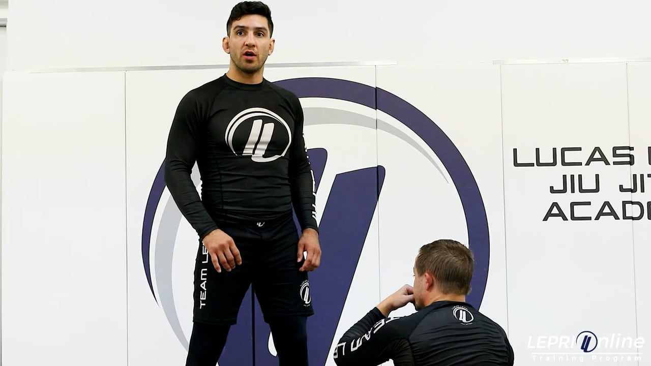 Professor Lucas Lepri teaches how to pass the open guard using the C grips on the shins. The opponent has the open guard and Lucas is standing. Lucas moves in and pushes the opponent back gripping both shins with the c grip. He moves to one side and pins one leg down placing his foot over the ankle. He now switches the c grips on the legs. This allows him to move to the north south position. In the north south position, he pummels his arms in and controls the opponents elbow on one side and the hip with the other arm. In another scenario, when Lucas moves to the north-south, the opponent tries to frame. Lucas breaks the frame by using his knee on the arm. If the opponent starts to turn in an attempt to go for the single leg, then Lucas brings his other elbow to the mat and changes his base to go to the side. Lucas controls the opponent's wrist from the back, and then pulls the opponent back to get the back control.