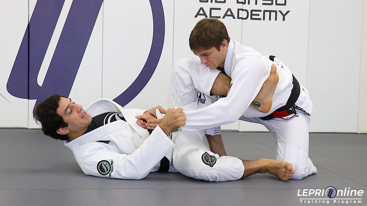 Professor Lucas Lepri teaches how to get the armbar after sweeping the opponent when they defend the guard. Lucas is playing guard and grips the sleeves. He places one foot on the bicep and the other foot is brought over the same side arm. Lucas then slides the foot across and places it under the armpit. Lucas now releases the foot from the bicep and places it on the same side knee. He kicks the knee as he pulls on the sleeves to sweep the opponent. Lucas follows on top and maintains control of the sleeves to finish with the armbar.