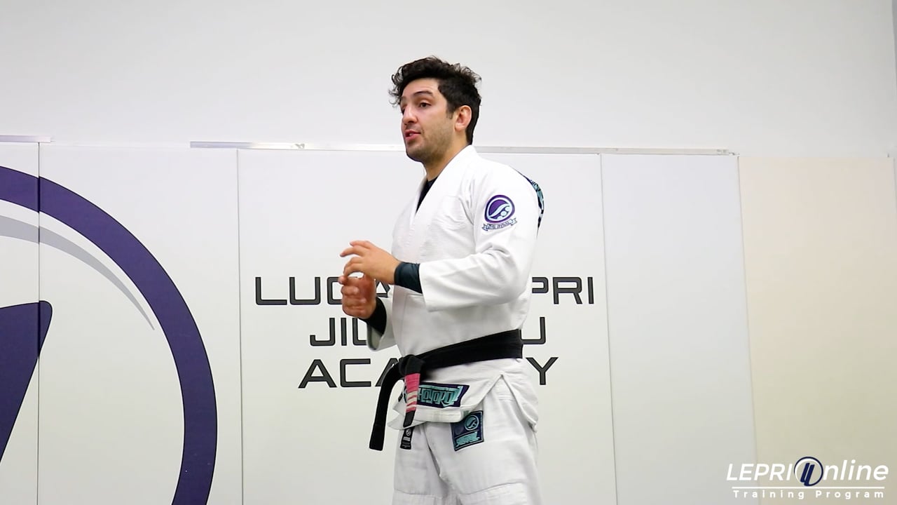 Professor Lucas Lepri teaches how to defend from a punch and take the opponent down by closing the distance. Lucas is standing and keeps his hand at chest level. The opponent starts to throw a punch and Lucas immediately moves in and blocks the biceps. The clinches and then steps to the side. He now uses his knee to bump the back of the opponent’s knee and uses his head on the chest to make the opponent fall back. Once on the mat, Lucas goes for the side control position.