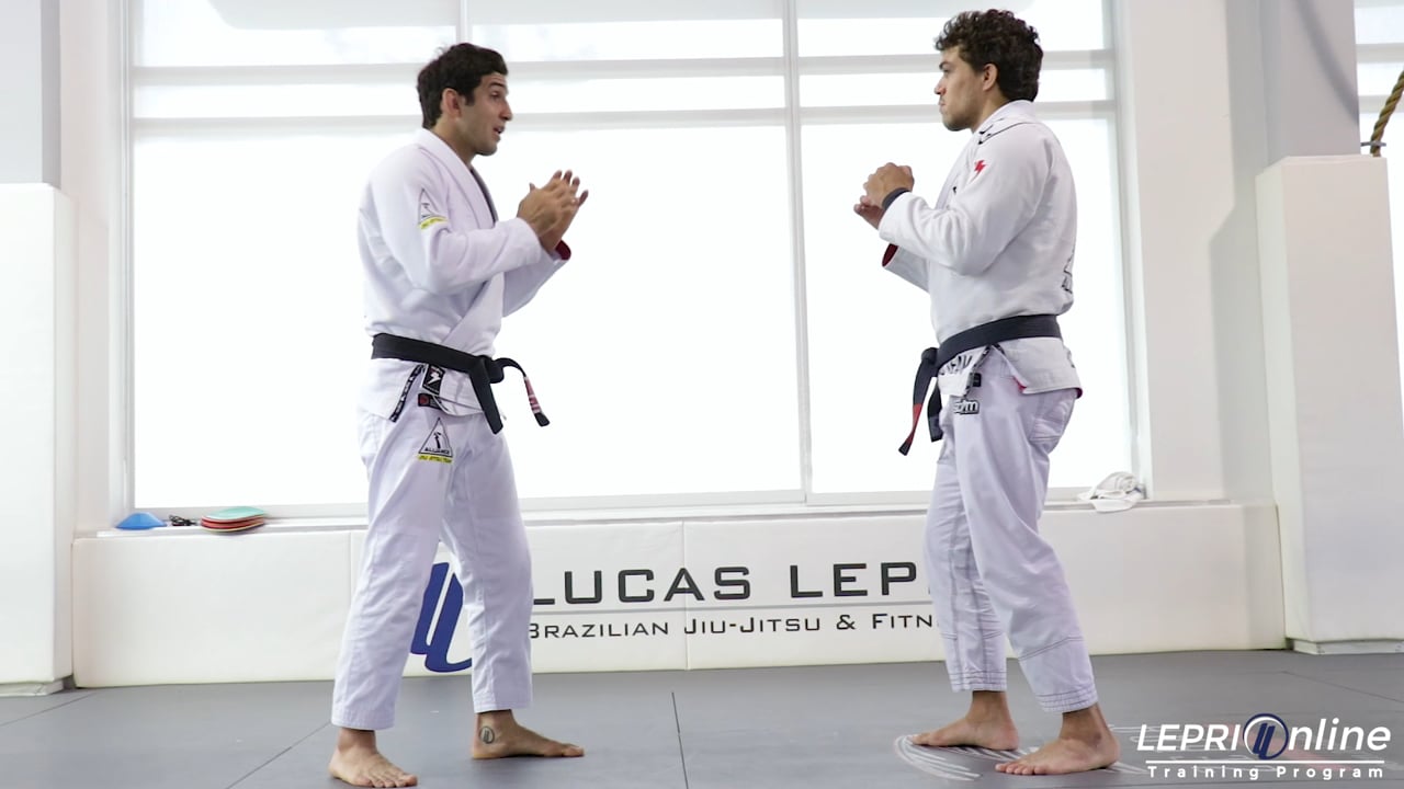 Professor Lucas Lepri demonstrates a defensive technique when an opponent is throwing multiple punches. The situation begins with both standing, and the opponent starts throwing multiple punches at Lucas. Lucas protects himself by elevating his elbow and keeping his hands close to his head. Lucas then steps into the opponent and clinches the opponent’s waist. With his head still on the outside, Lucas steps his outside leg behind and around the opponent’s leg. Lucas then turns into the trapped leg, taking the opponent down and ending in the mount position.