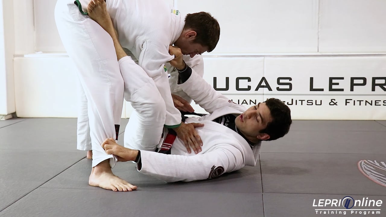 Professor Lucas Lepri shows how to recompose the guard when the opponent tries to pass and then tries to go to the North South position. The opponent has a lapel and pants grip on Lucas. As he tries to pass, Lucas blocks the opponent’s shoulder with both of his hands. The opponent keeps walking around and tries to go to the North South position. Lucas brings his outside leg under the opponent’s arm that has the lapel grip. He uses that leg to help him spin around to recompose the guard.