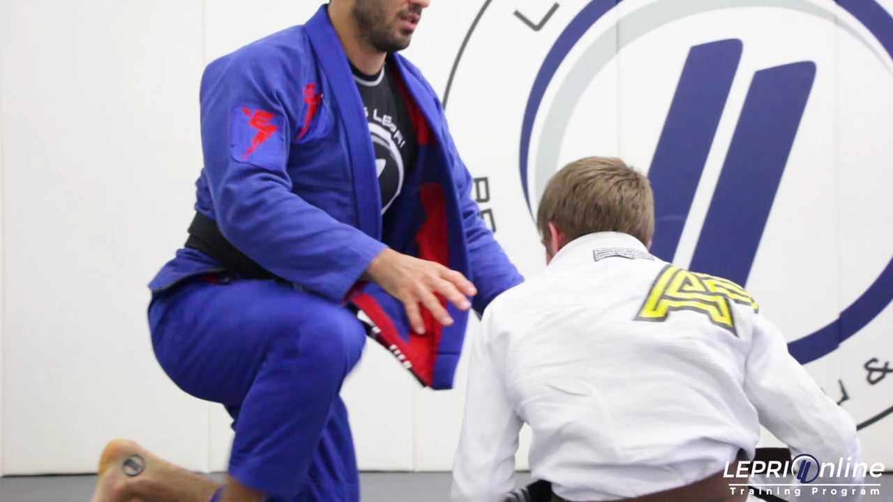 Professor Lucas Lepri shows what to do when an opponent prevents Lucas from completing the previous technique. As in the previous technique, Lucas frees his knee and attempts to circle around to take the opponent’s back. In this situation, as Lucas circles around, the opponent sits up and uses his collar grip to keep Lucas’ upper body away. Lucas responds by circling around toward the back by quickly clapping his hand down on the opponent’s elbow, forcing the opponent back down onto the mat where Lucas can complete the pass to side control.