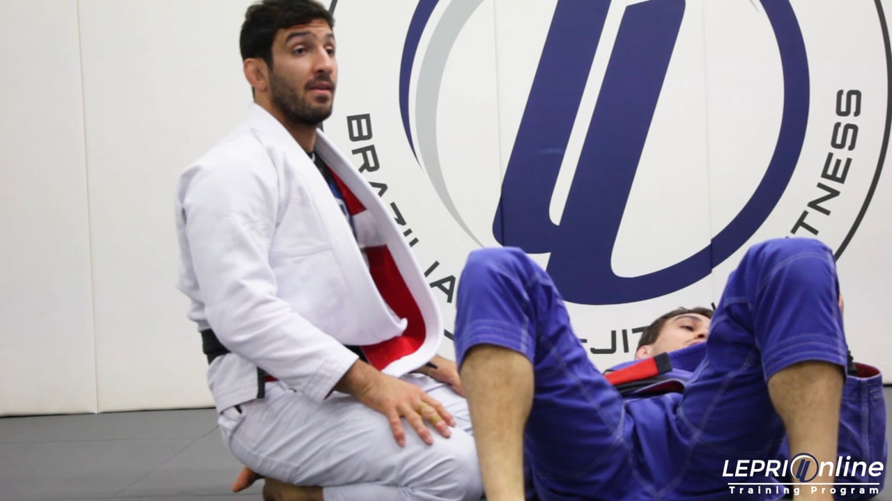 Professor Lucas Lepri demonstrates a technique for passing an opponent’s reverse De La Riva guard when the opponent is able to trap Lucas’ free leg in an attempt to transition to one leg X-Guard. As soon as the opponent underhooks the leg, Lucas puts that knee on the floor and windshield wipers his foot to trap the opponent’s leg. Lucas then shifts his eight to underhook the opponent’s leg. He completes the pass to side control by applying a cross face with the other arm and falling to his hip on the side opposite the leg he has underhooked.