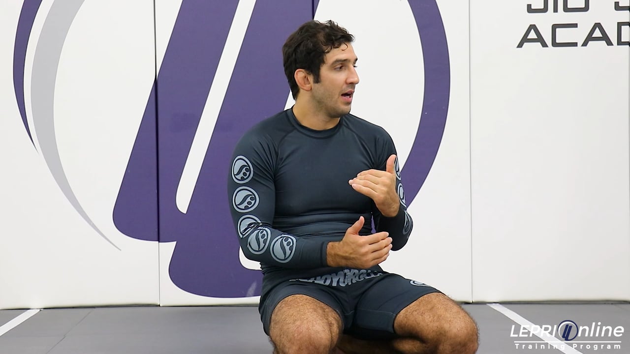 Professor Lucas Lepri teaches how to sweep the opponent from the reverse de la riva when the opponent attempts to pass using the knee cut. When the opponent attempts to pass, Lucas grips the ankle and locks his feet together. He pushes the opponent to unbalance and to make him react. When the opponent reacts, Lucas unlocks his feet and spins under the opponent. He reaches for the far side ankle and drops his leg so he can come up. Lucas controls the ankle and reaches under the opponent to grip the far side waist. From here, Lucas pushes forward and takes the opponent down.