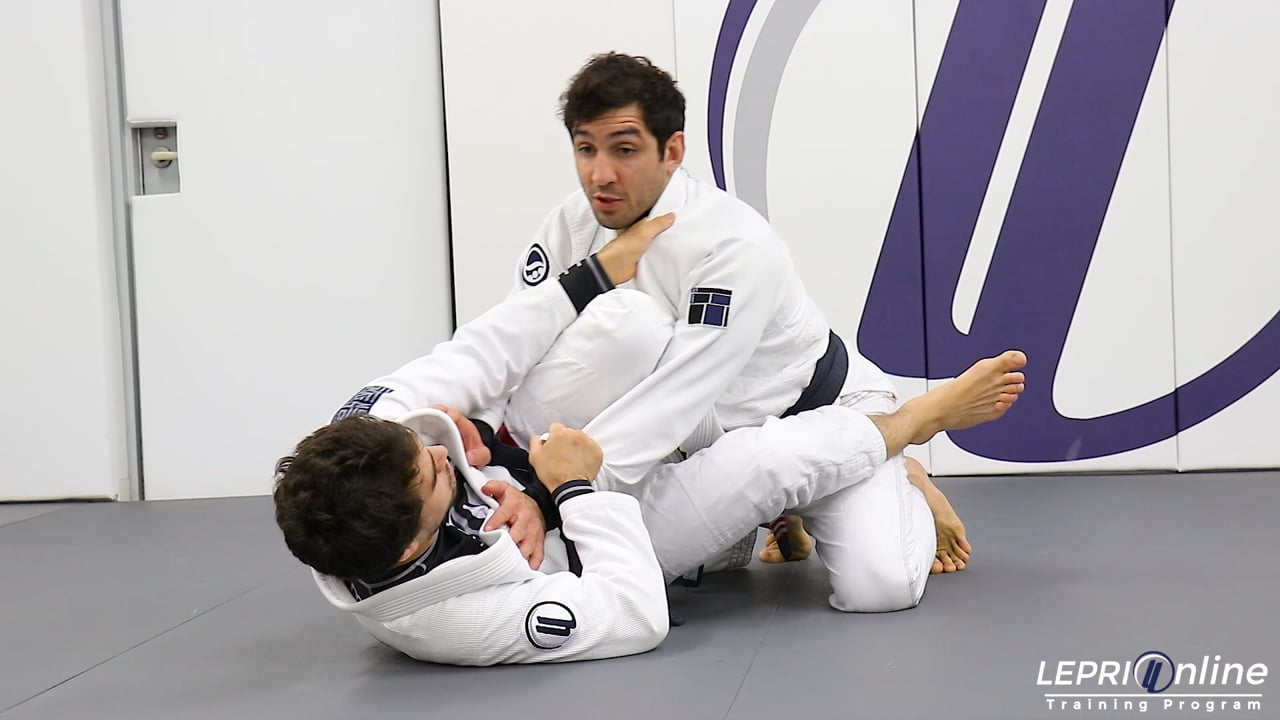 Professor Lucas Lepri shows how to escape from the mount position after being swept by the opponent using the scissor sweep. Lucas starts in the opponent’s closed guard. The opponent grips Lucas’ sleeve and the same side collar. He unlocks his legs so he can place his knee on Lucas’ chest. The opponent now pulls and pushes Lucas, when Lucas reacts by pushing forward is when the opponent sweeps him to the mount position. Immediately after the opponent gets the mount, Lucas raises his hips to make the opponent post the hands on the mat. Lucas then traps the arm and same side foot to prevent the opponent from posting so he can then bridge and reverse the opponent to get to his closed guard.