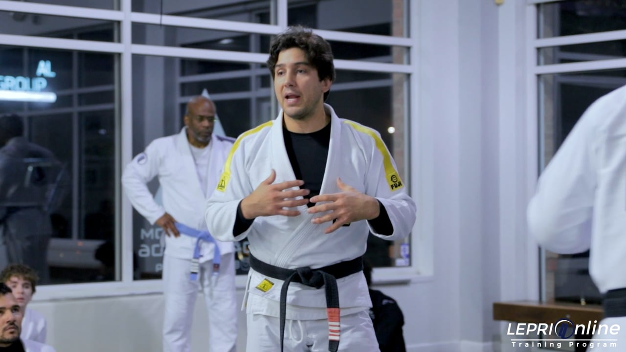 Professor Lucas Lepri demonstrates a self-defense technique for controlling an attacker without using strikes. He starts by protecting his face and closing the distance, then secures a grip on the attacker's arm and waist. Lucas uses his elbow to pin the attacker's wrist and prevents them from throwing punches. He then steps in front of the opponent and executes the O-Goshi hip throw. Lucas maintains control on the ground by going to the knee on belly position.