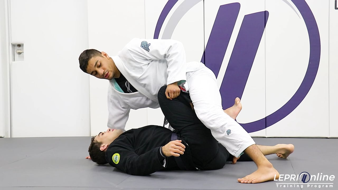 Professor Andre Gois teaches how to defend from the shin to shin when the opponent tries to use it to go to the single x guard. Andre is standing and the opponent sits up and places his shin against Andre’s. He then places his hand behind Andre’s leg. Andre immediately starts to defend by gripping the opponent’s top leg to push it down as he leans to the side and posts his other hand on the mat. He then pushes down on the leg again and circles his own leg around, placing it under the opponent’s. Andre now applies pressure and then switches his legs to go to the side control position.