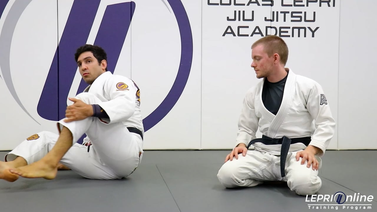 Professor Lucas Lepri teaches how to escape from the north south position, after a failed side control escape. Lucas is in the opponent’s side control position and his hands are controlling the opponent's shoulder. Lucas attempts to escape from the side control by pushing the opponent, but the opponent immediately transitions to the north south position. To escape this position, Lucas starts by gripping the opponent’s belt in the middle. He rocks his legs side to side and then pushes on the belt extending his arm as he comes up on his other shoulder. From here, Lucas escapes and can go to the closed guard.