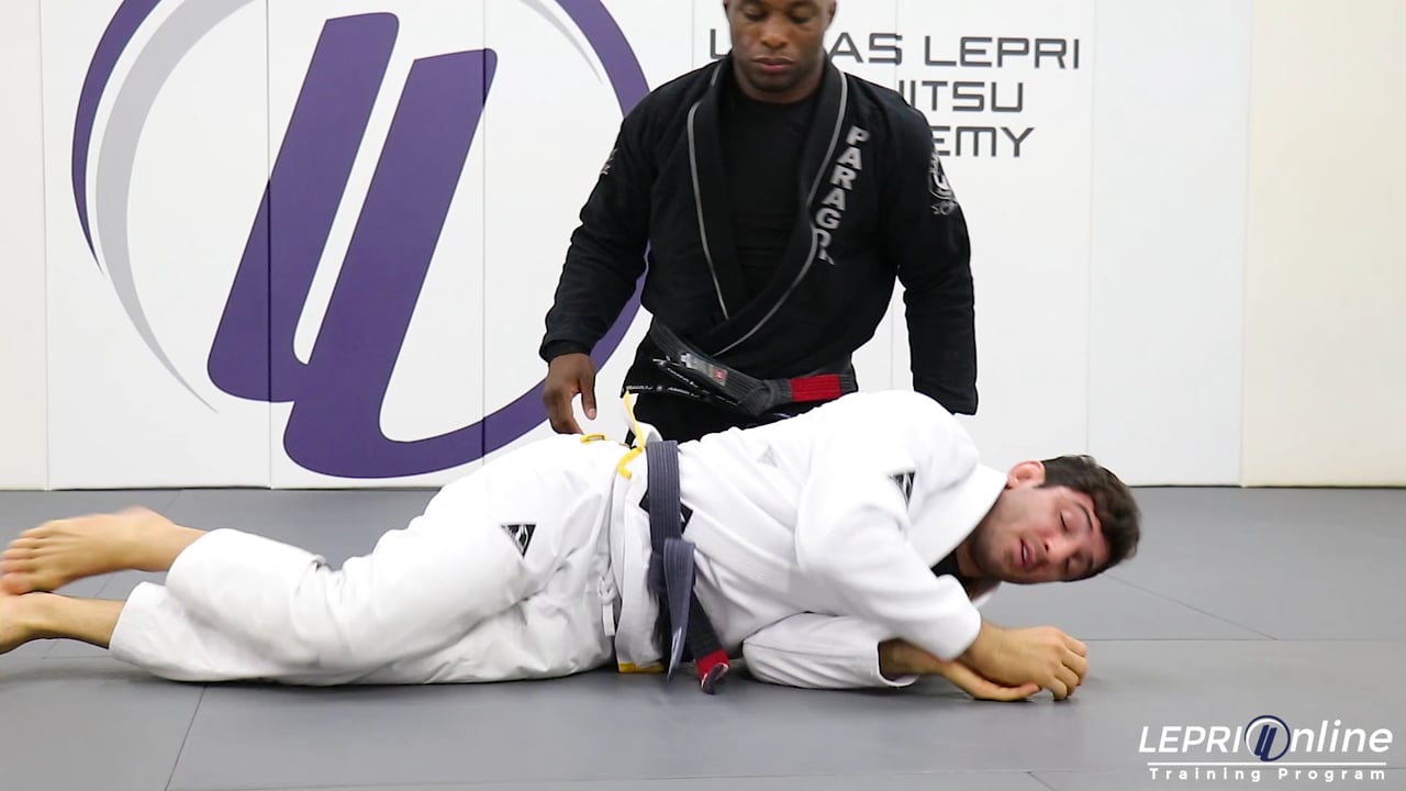 Professor Lucas Lepri show how to escape from the side control position when the opponent controls the hip and tries to control the arm. Lucas bridges so he can slide his inside arm under the opponent’s arm to block him. In this scenario, the opponent brings his arm over to try and control Lucas’ arm. As soon as the opponent moves his arm over, Lucas pushes under the arm and moves the opponent away. Lucas can now recompose the guard.
