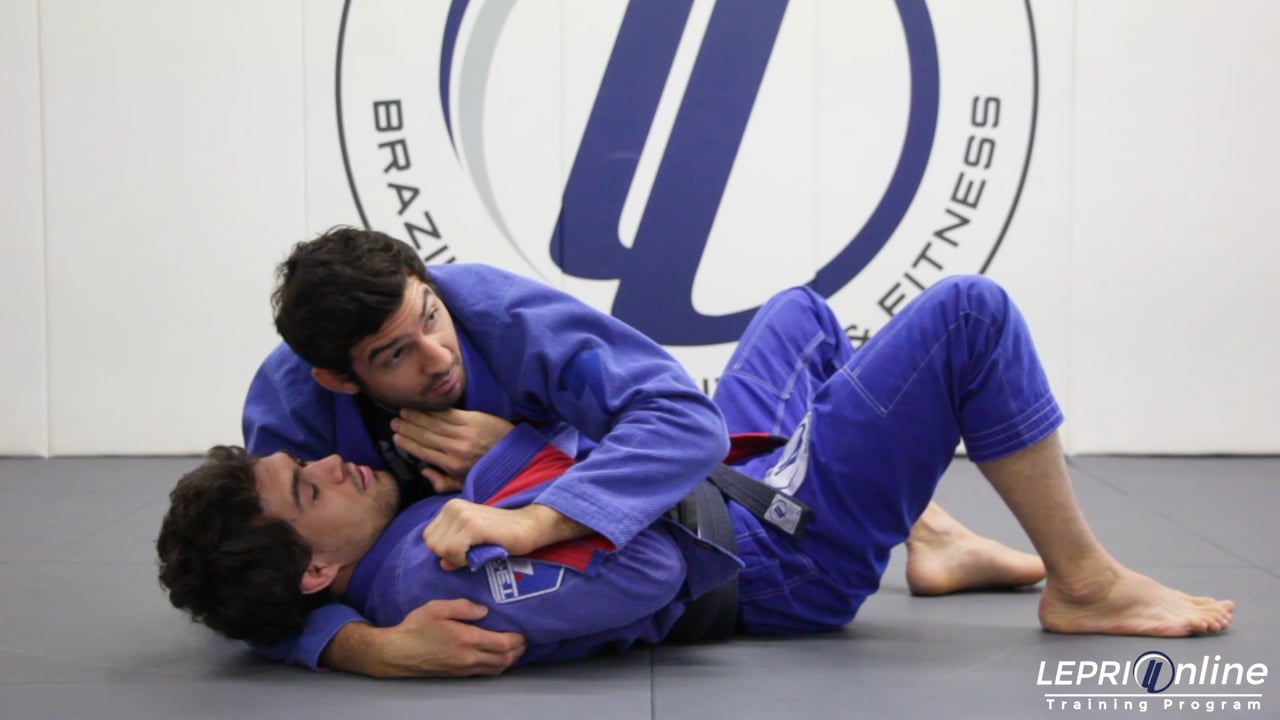 Professor Lucas Lepri shows a how to get the triangle submission from side control by trapping the opponent using their lapel. As Lucas is in the side control position the opponent uses his arm to frame. Lucas uses his head and neck to collapse the opponent’s arm that is being used to frame. Lucas then uses his left hand to pull out the opponent’s lapel and feeds over the opponent’s collapsed arm to his right hand. Once in this position Lucas uses his right knee to isolate the opponent’s left arm, bringing his knee up to the opponent’s back, and postures up. He then uses his left hand to grab the outside part of the opponent’s left knee to push it to the ground in front of him. The opponent now has no way of using his hands or knees to block Lucas. Lucas swings his left knee over the opponent, placing it over the opponent’s neck. As he swings his leg over, he releases the grip on the outside knee. Once he has his leg over, he releases the grip on the lapel and grips his own shin. Lucas then rolls forward while still holding his shin and then brings his other leg over his leg, locking the triangle on the opponent.