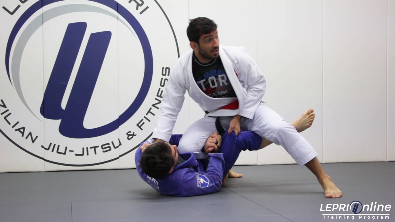 Professor Lucas Lepri shows a variation of the previous technique. In this situation, as soon as the opponent goes for the single leg Lucas puts pressure on the opponent using his chest. He grabs the opponent’s belt and finds a grip on the opponent’s knee. Hopping forward, Lucas sits and rolls over his shoulder to end up on top of the opponent. Grabbing the opponent’s collar, Lucas is able to release the opponent’s leg and base as he completes a knee cut pass to side control.