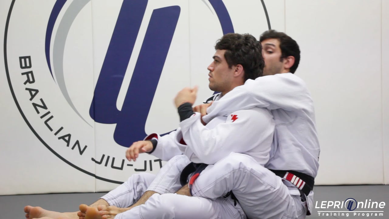 Professor Lucas Lepri demonstrates a single wing choke from the back mount. The situation begins with the opponent in Lucas’ back mount and Lucas with a seatbelt grip. In this situation, the opponent bridges directly up on top of Lucas. Lucas uses his right hand, which was under the opponent’s armpit, to open the opponent’s right collar, and reaches his left hand around the opponent’s neck to establish a deep collar grip. Now, his right arm reaches up and behind the opponent’s neck as he pushes the opponent down and falls to his left side. From here, Lucas extends his right arm behind the opponent’s neck to complete the choke.