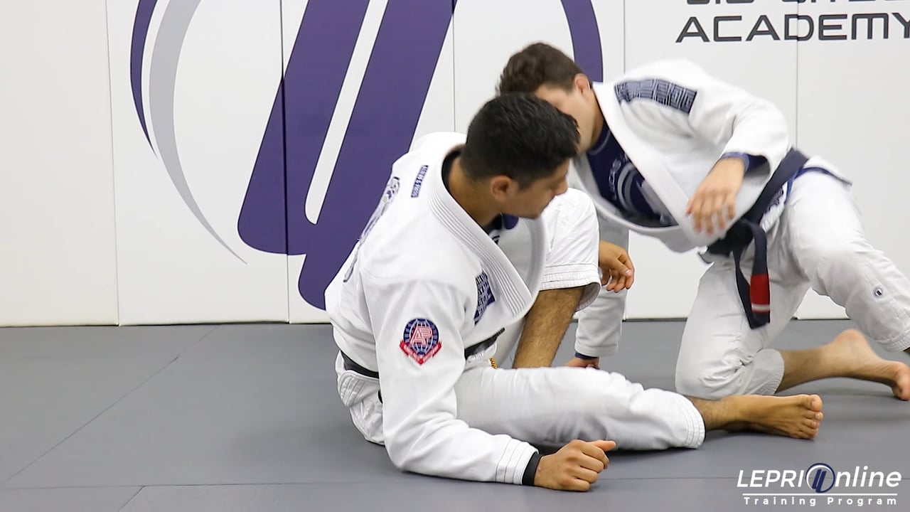 Professor Andre Gois teaches how to sweep the opponent using the single leg x guard. Andre starts with his shin against the opponent’s and then transitions to the single x guard. He places his outside hook inside and pushes the opponent away to make him post on the mat. As the opponent tries to come back, Andre moves his other foot down to trap the ankle. He now pushes the opponent away with his hook as he blocks the ankle with his foot. The opponent is swept and Andre comes up. From here, he can work on passing the opponent’s guard.